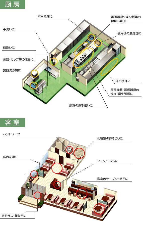 また、現場におけるより一層のサービス提供・向上に向け、消耗品、備品の見直し、コスト削減、衛生管理、環境問題改善への取り組みなど、様々な用途・エリアのサポートをいたします。